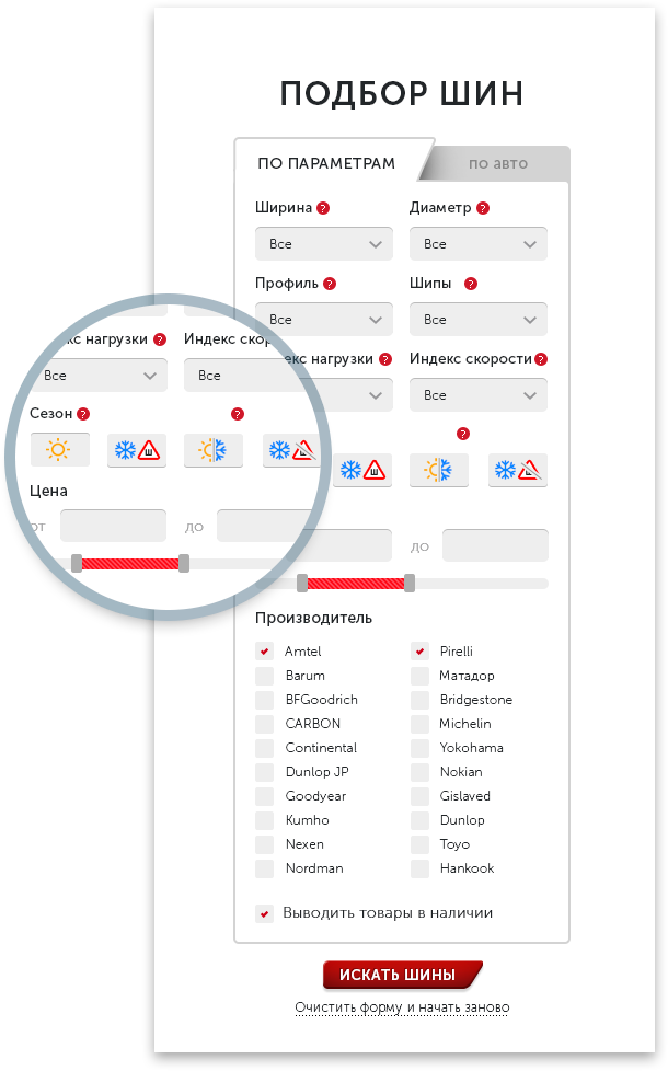 В рамках создания специализированного интернет-магазина allrad.ru нами была оптимизирована и улучшена система поиска в каталогах автомобильных шин и дисков, а также запчастей. Система синхронизации поиска по каталогам шин и дисков значительно упрощает поиск и требует минимальных затрат времени для ввода всех характеристик. При подборе шин по марке автомобиля в результатах поиска можно увидеть несколько комплектаций шин и дисков.